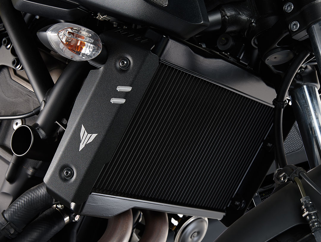 •與水箱護網一體設計的水箱護蓋,上面印有MT家族LOGO,搭配高質感黑色塗裝,可增添MT-07造型的個性感。