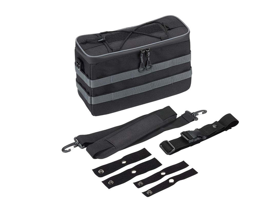 可搭配(後側功能掛架BBJQF8400000/BBJQF8401000)掛附機車後側架,附有掛附扣具,提供額外置物空間,亦可快速拆下、側背使用。