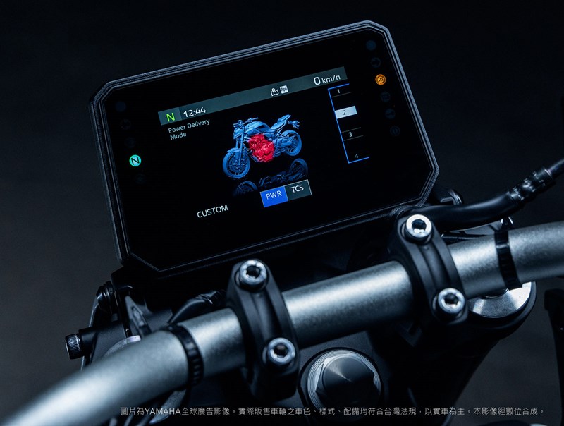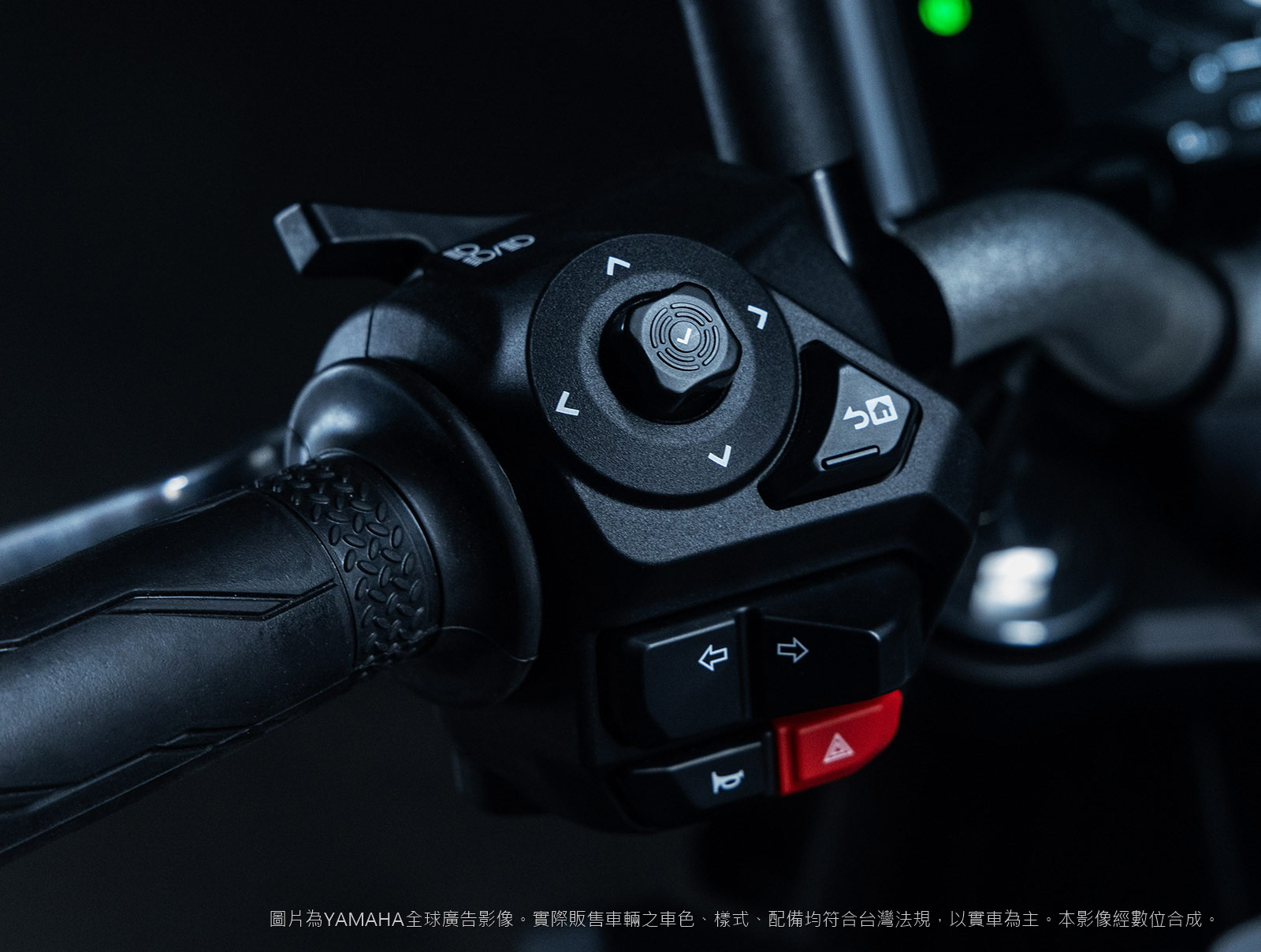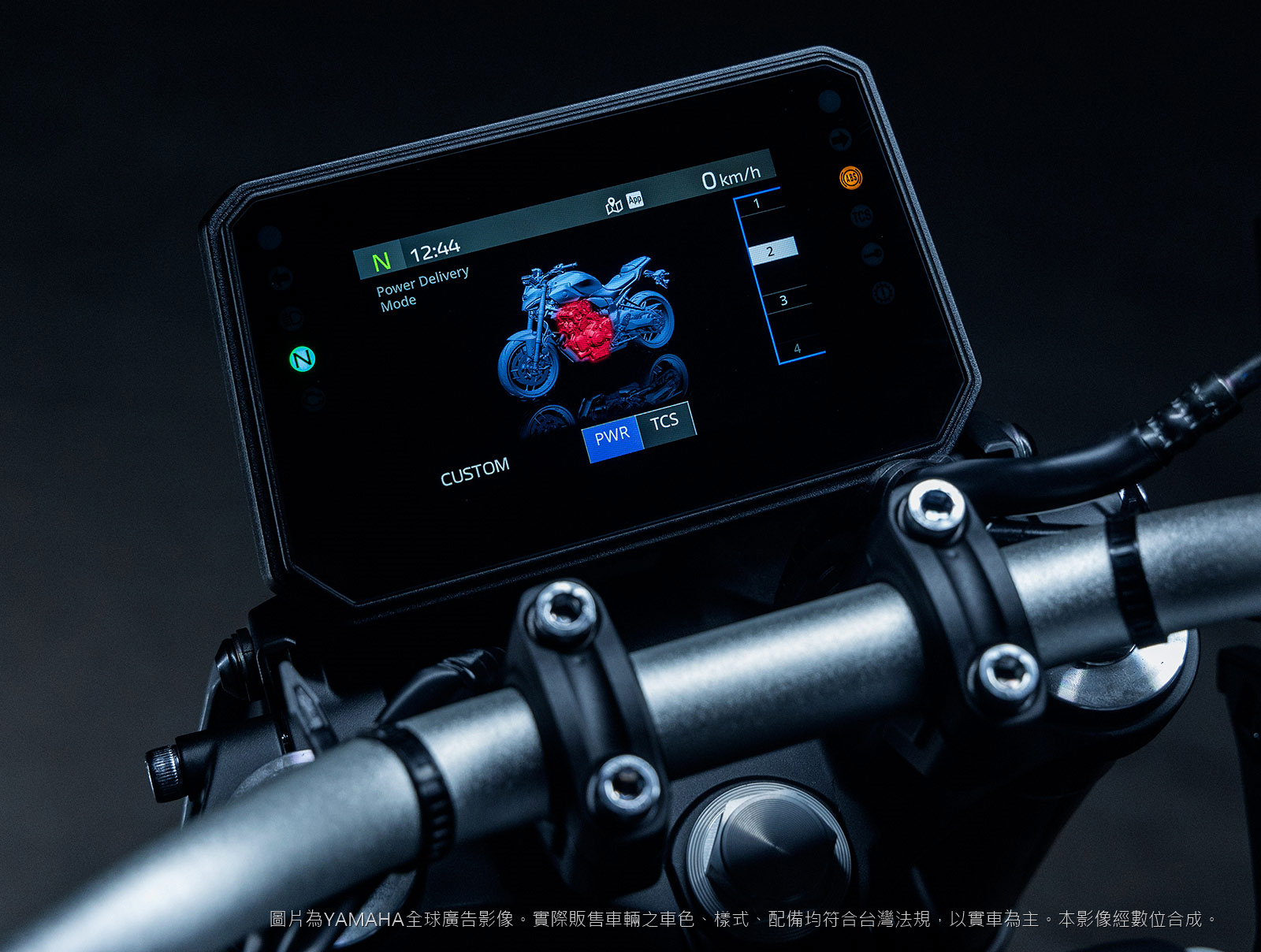 全新 YRC 騎乘模式支援三種油門設定,包含 SPORT 與 STREET 預設模式,以及可依個人偏好調整的 CUSTOM 模式,並可搭配可切換式循跡控制系統(TCS),滿足多元街道與風格化騎乘需求。