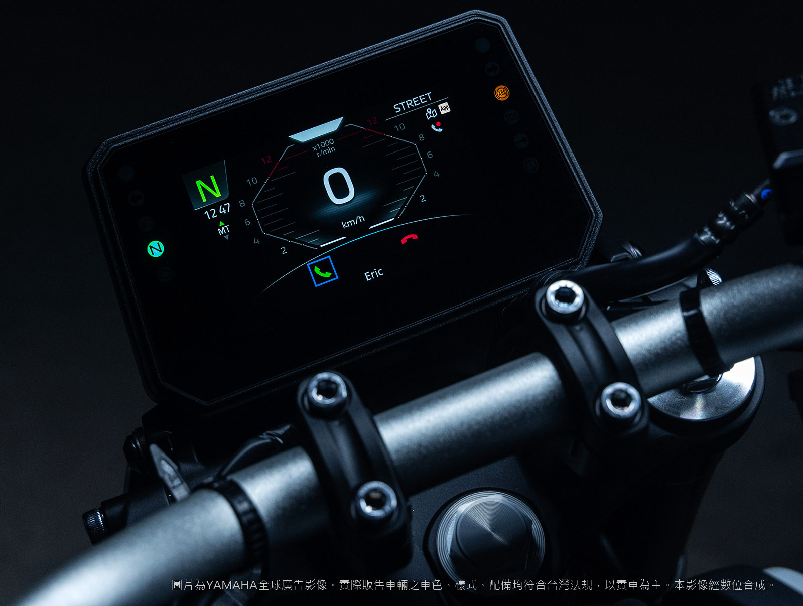 MT-07 搭載 5 吋全彩 TFT 儀表,支援多款主題顯示與智慧連線功能。