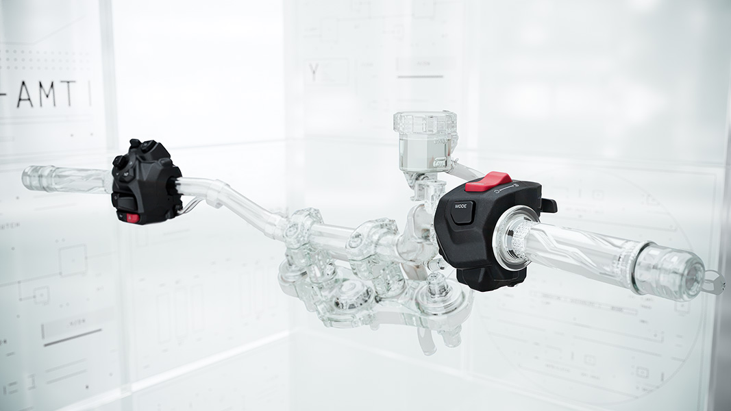 透過右側車把開關頂部的 AT/MT 撥桿,可直覺地在行進中,輕鬆切換 MT 和 AT 模式。 切換至 MT 手動模式下,可使用左手把的換檔撥片換檔,並且可自由使用選擇雙指(食指及拇指操作)或單指換檔。在 AT全自動模式中,使用拇指操作MODE模式鍵,在 「D+ 」和 「D 」之間切換。