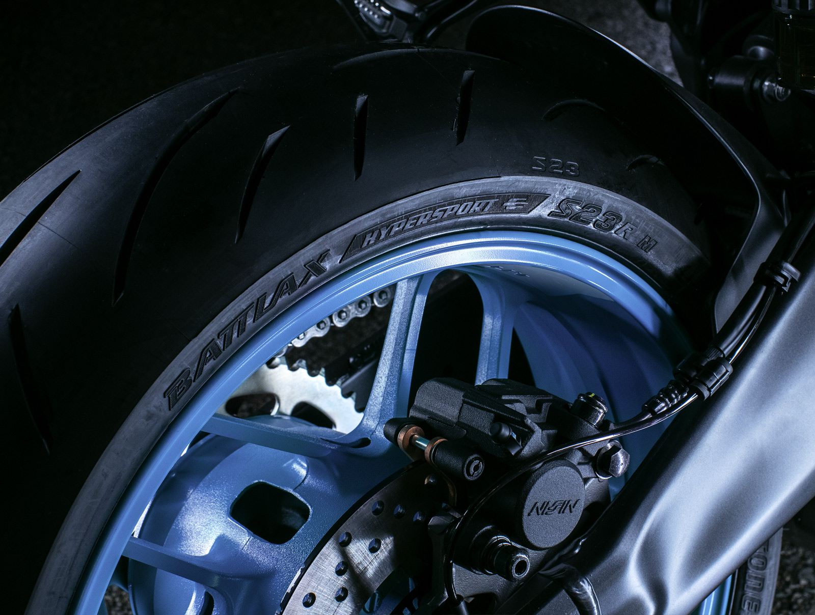 進化的全可調 41 mm KYB® 倒立式前叉,與緊湊、高剛性的車架特點結合呼應,創造出色的車輛穩定性及可控性,同時搭配全新普利司通 Battlax Hypersport S23 M 輪胎,確保騎士在豐沛的扭力加速中獲得最佳的操駕體驗。